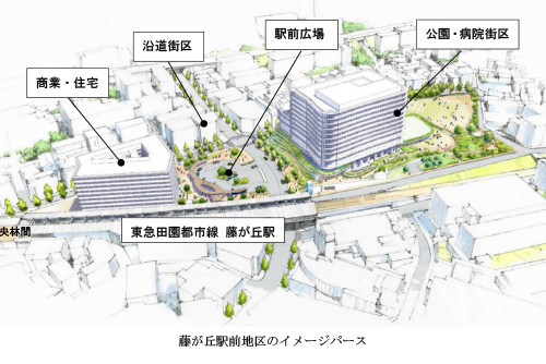 東急田園都市線「藤が丘駅」周辺において、 豊かな緑に囲まれ、人にやさしく、 多世代が元気に暮らせるまちづくりの実現に向け、 「駅前施設」「病院」「公園」が一体となった 新たなまちづくりに取り組んでいます。